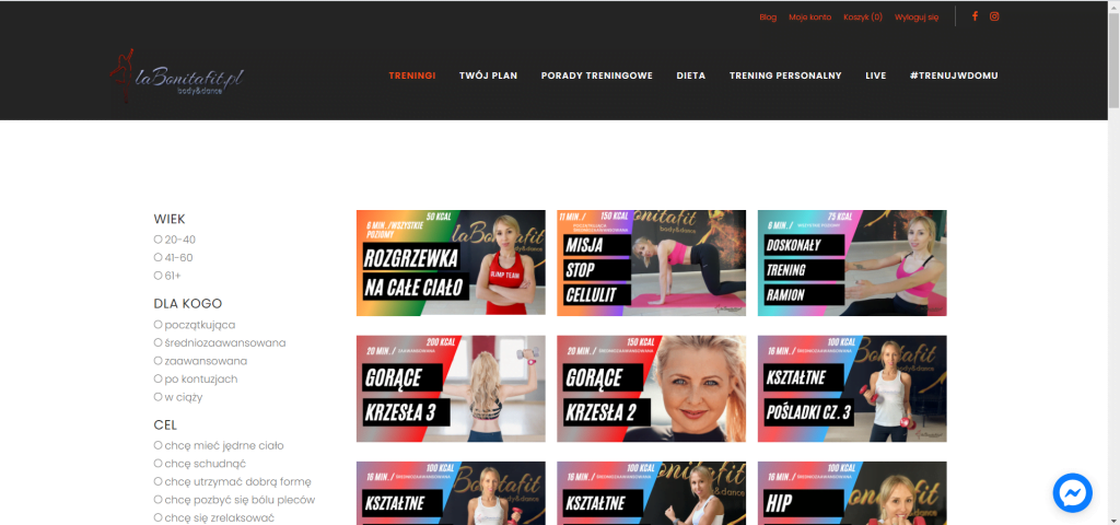 Teraz przejdźmy do menu górnego. Pierwszą zakładką znajdującą się tam jest zakładka „Treningi”, gdzie wyświetlają się wszystkie filmy treningowe dostępne na platformie. Po lewej stronie znajdują się filtry, dzięki którym w szybszy sposób znajdziesz interesujący Cię trening według kategorii wiekowej, zaawansowania, celu, części ciała, czasu trwania, rodzaju treningu, czy rodzaju sprzętu jakim dysponujesz.