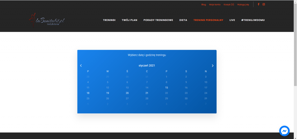 Piątą zakładką jest „Trening personalny”. Tutaj pojawia się kalendarz, w którym możesz wybrać datę i godzinę treningu personalnego online. Trening personalny odbywa się za pomocą apliakcji ZOOM. Dzięki tej formie trenerka widzi czy dobrze technicznie wykonujesz ćwiczenia, ma możliwość pomóc Ci, żebyś nie nabawiła sie kontuzji i cały trening miał sens. To też świetna opcja, jeśli sama nie możesz zmotywować się do ćwiczeń, bo umówienie się na konkretną godzinę i ćwiczenia pod okiem trenera zobowiązują.