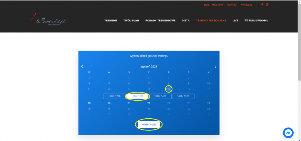 Po zaznaczeniu daty, godziny i kliknięciu „Kontynuuj” pokaże się strona z informacjami o wybranym treningu i Twoimi danymi.
