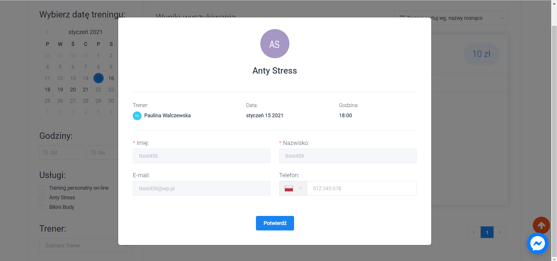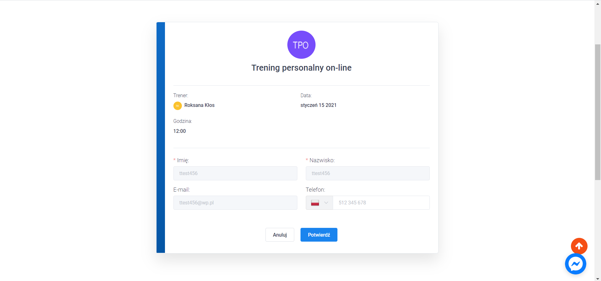 Po zaznaczeniu daty, godziny i kliknięciu „Kontynuuj” pokaże się strona z informacjami o wybranym treningu i Twoimi danymi.