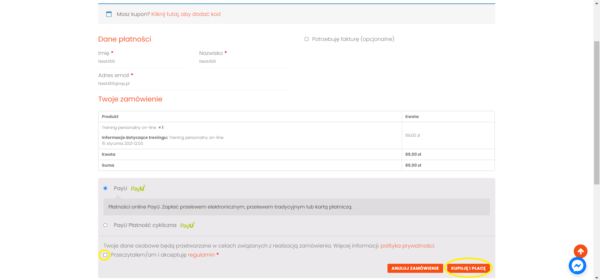W koszyku kliknij „Przejdź do zamówienia” co przeniesie Cię na stronę z danymi do płatności i Twoim zamówieniem. Tutaj zaznacz „akceptuję regulamin”, następnie „Kupuję i płacę”, co przekieruje Cię już bezpośrednio do wybrania metody płatności.