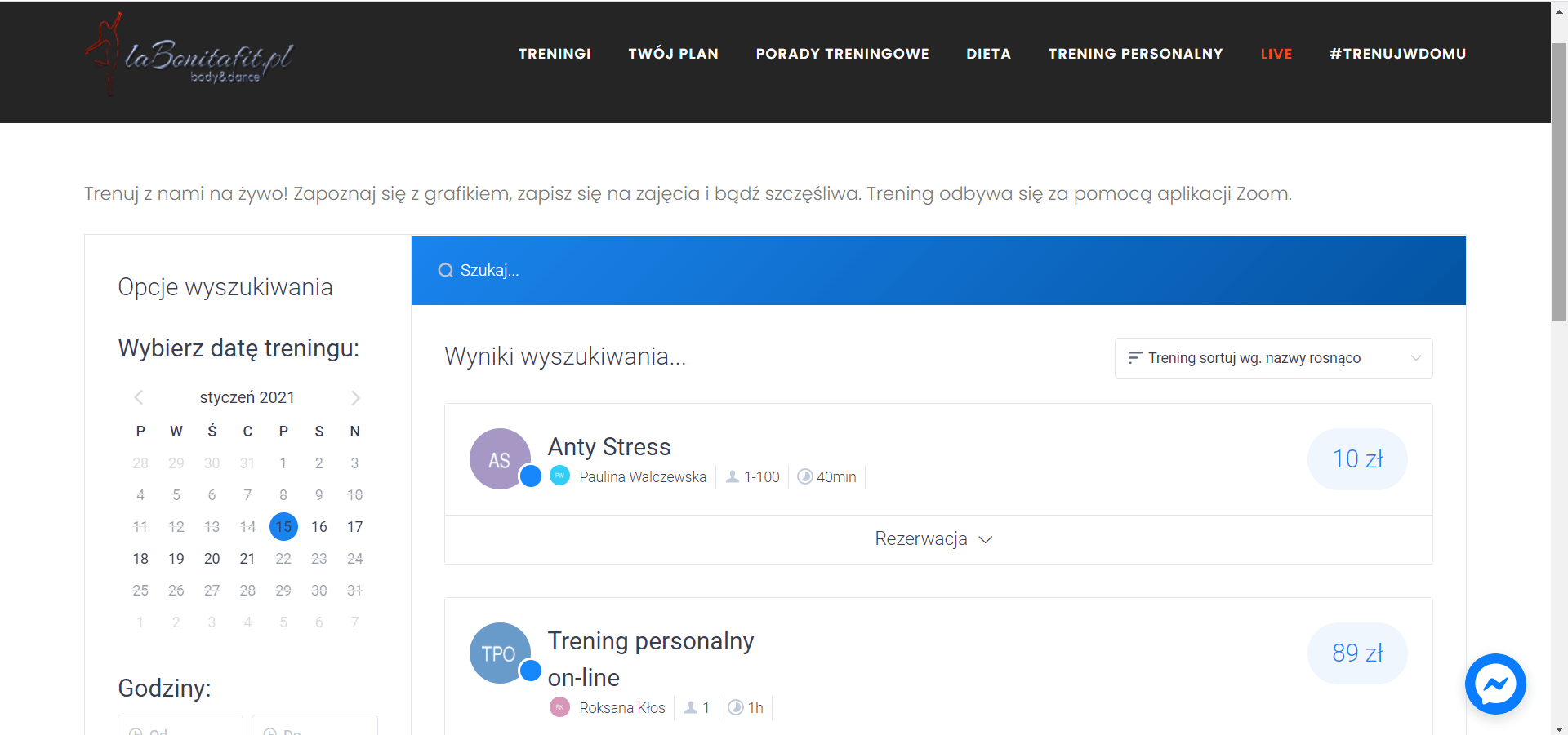 Zakładka z treningami pozwala w szybszy sposób wyszukać trening według Twoich kryteriów dzięki filtrom. Indywidualny plan treningowy będzie widoczny w odpowiedniej zakładce po wypełnieniu krótkiej ankiety. Dzięki wyosobnieniu zakładki z dietami już nie będziesz musiała szukać ich pod filmikami. W łatwiejszy sposób będziesz mogła zapisać się na treningi personalne przez udostępniony kalendarz z dostępnymi dniami i godzinami. Wprowadziłyśmy także treningi grupowe live, na które również możesz się zapisać przechodząc do grafiku w zakładce live.