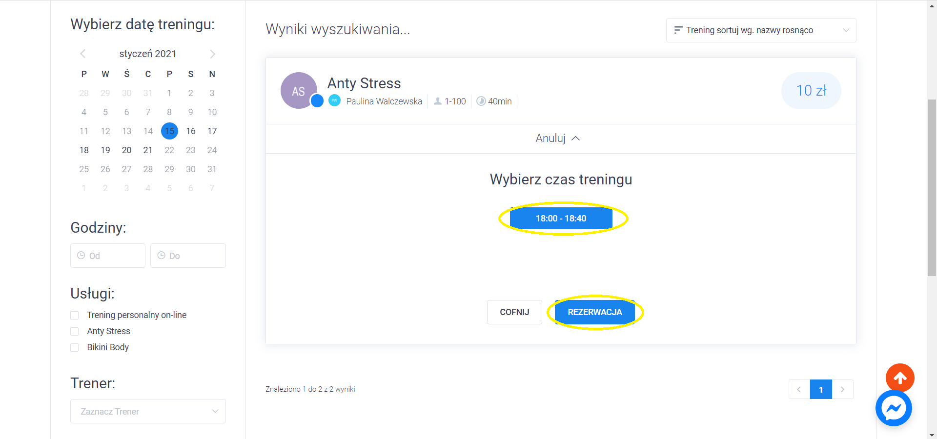 Aby skutecznie się zapisać musisz pod wybranym treningiem kliknąć „Rezerwacja”, zaznaczyć godzinę zajęć i „Rezerwacja”.