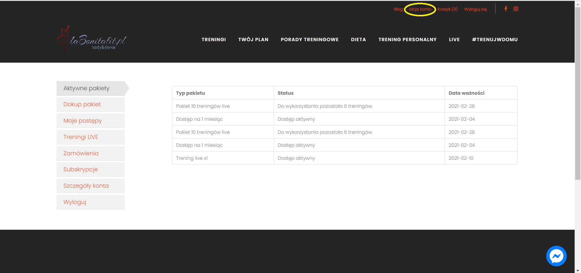 Po zalogowaniu lub rejestracji pojawi się strona z Twoim panelem klienta. Po lewej stronie znajdują się zakładki dotyczące Twojego konta. Pierwsza z nich, to „Aktywne pakiety”, gdzie są wszystkie informacje o aktualnie aktywnych pakietach. W drugiej, „Dokup pakiet”, będziesz mogła dokupić kolejny pakiet z super zniżką 10%. W zakładce „Moje postępy” będziesz mogła wpisywać i monitorować swoje postępy treningowe i śledzić przemianę. „Treningi LIVE” to zakładka, w której będziesz widziała wszystkie treningi live, na które się zapisałaś. W „Zamówieniach” znajdziesz całą historię swoich zamówień. „Subskrypcje”, to miejsce, gdzie po wykupieniu pakietu z automatycznie odnawialną subskrypcją pojawi Ci się informacja o niej. Ostatnia zakładka „Szczegóły konta”, to miejsce, w którym możesz uzupełnić swoje dane lub zmienić hasło.