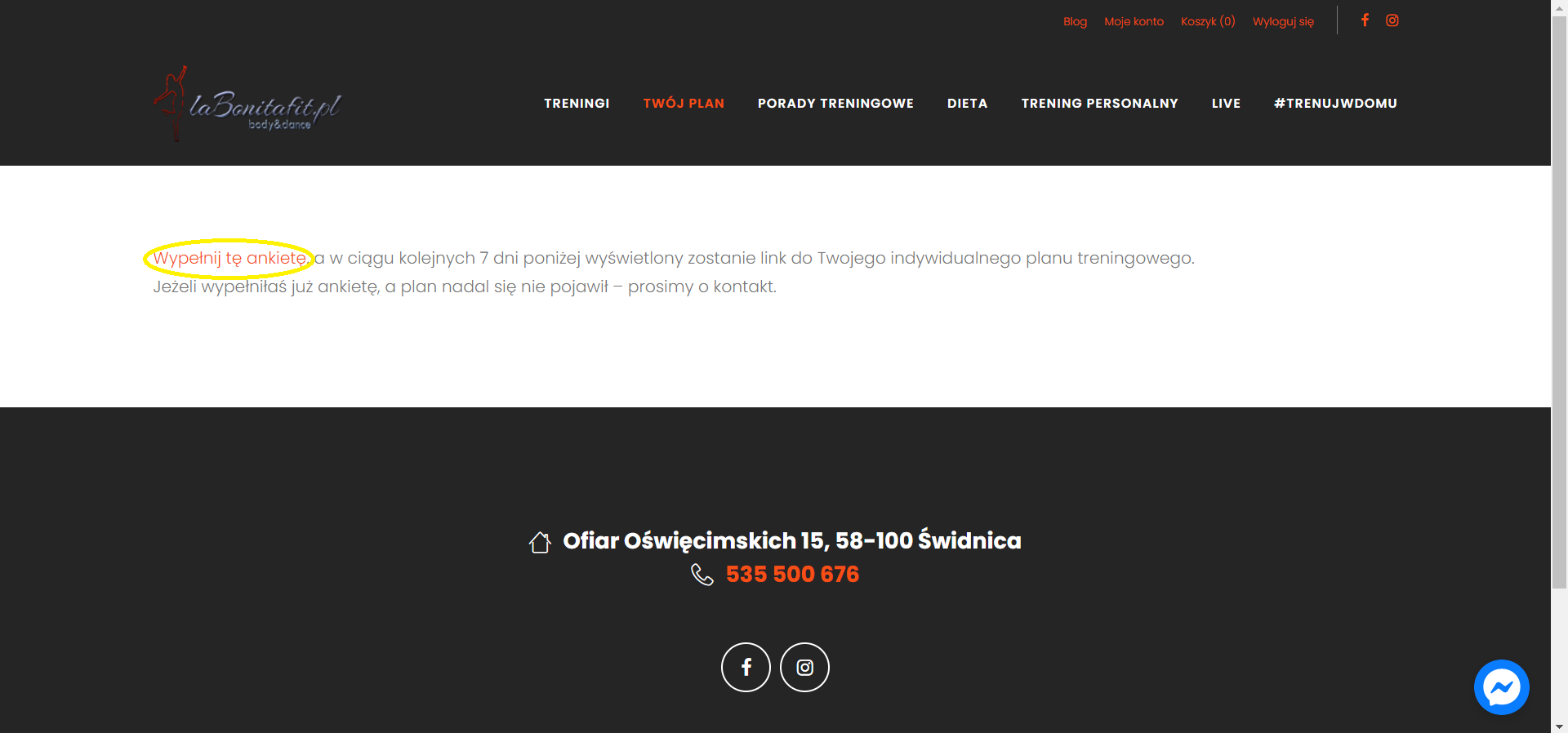 Jeśli posiadasz wykupioną spersonalizowaną dietę, to po kliknięciu w “Wypełnij tę ankietę” pojawi się ankieta dietetyczna, po której wypełnieniu otrzymasz swój indywidualny jadłospis w ciągu 7 dni.